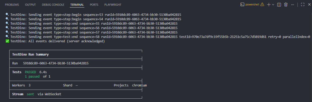 Every Playwright CLI flag works the same: --project, --grep, --workers, --shard, --headed. Nothing changes except results now stream to the TestDino dashboard in real time via WebSocket.