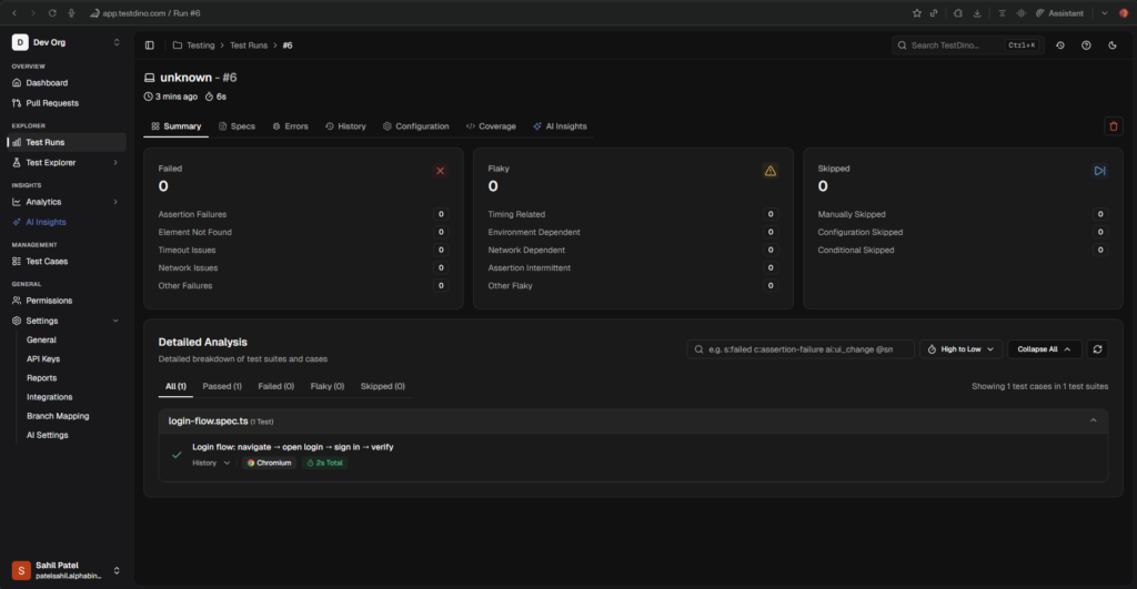 Generating tests is only half the workflow. Once your suite grows past a handful of specs, you need centralized reporting, failure tracking, and visibility into what broke and why. This is where TestDino fits in.