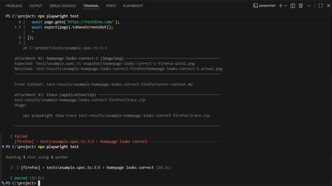 Playwright visual testing compares screenshots against baseline images and fails tests when pixels differ beyond configured tolerances.