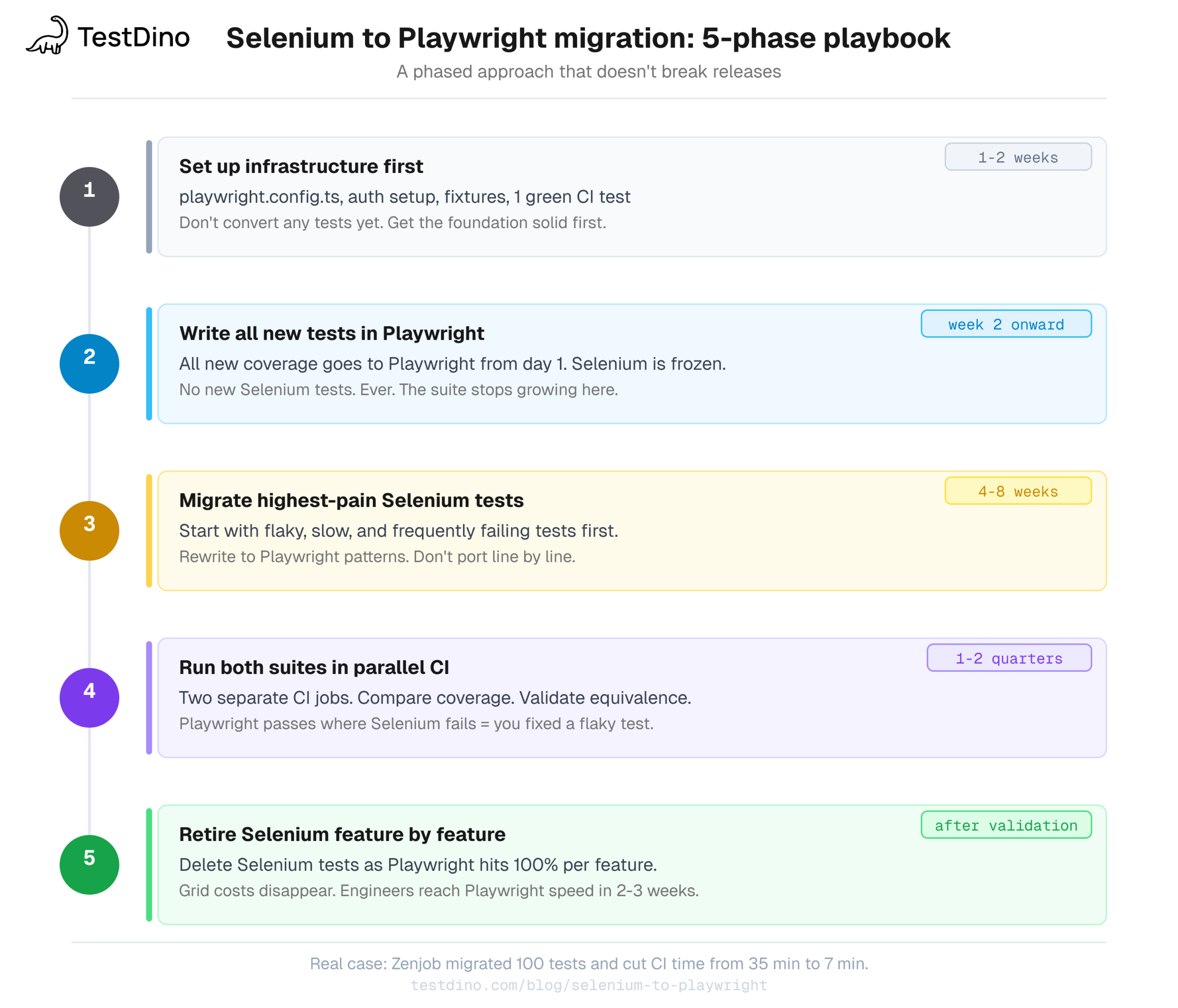 The part that makes or breaks it is the approach. Infrastructure before tests. One person who owns it. New tests in Playwright from day 1. High-pain tests migrated first. Both suites in CI together until you're confident. Selenium retired feature by feature.