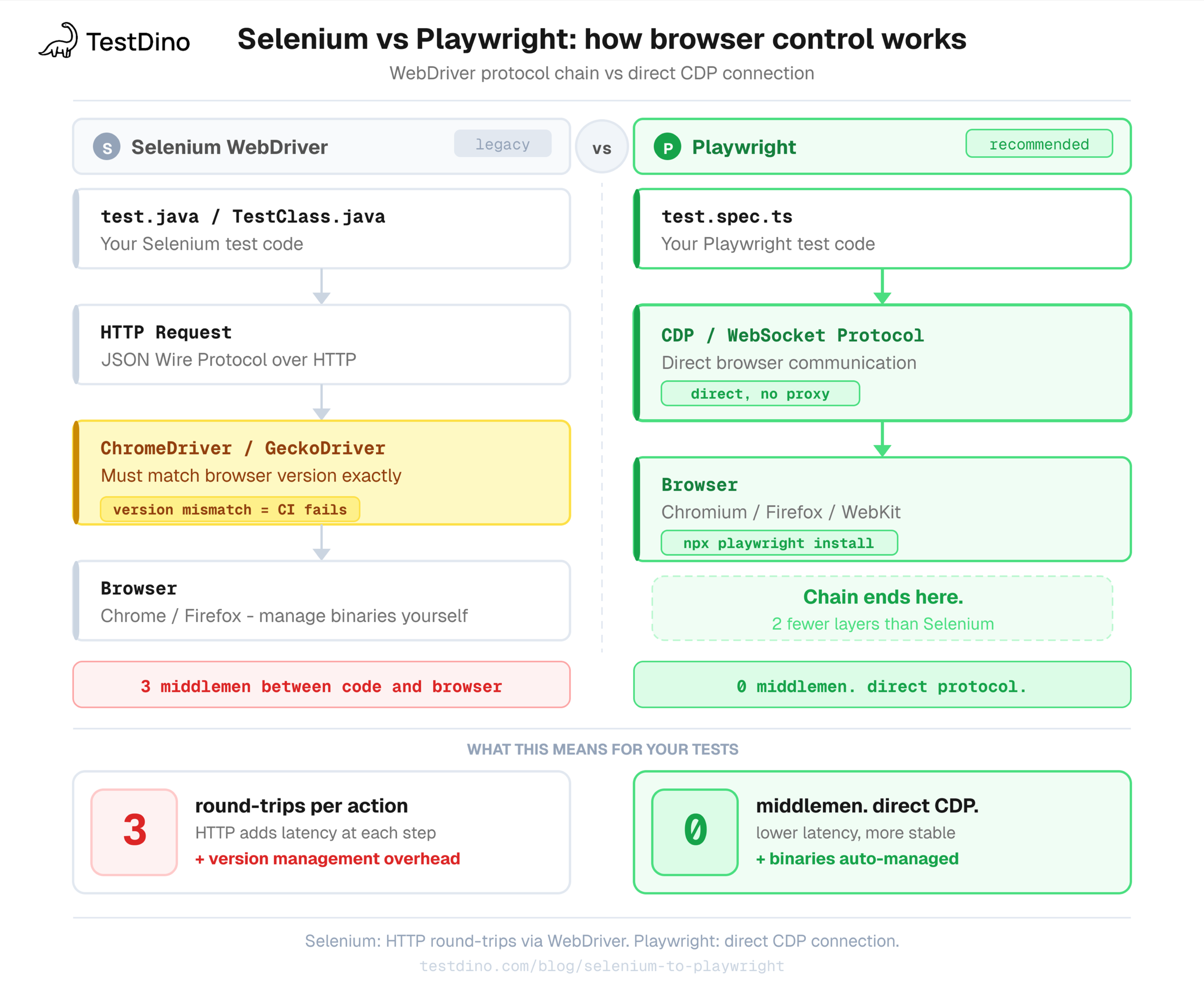 Playwright connects directly to browsers via Chrome DevTools Protocol (CDP) for Chromium, Firefox's debugging protocol, and a WebKit-specific protocol for Safari. No middleman. The result: lower latency, tighter browser control, and no driver version mismatch.