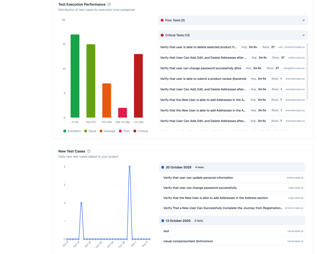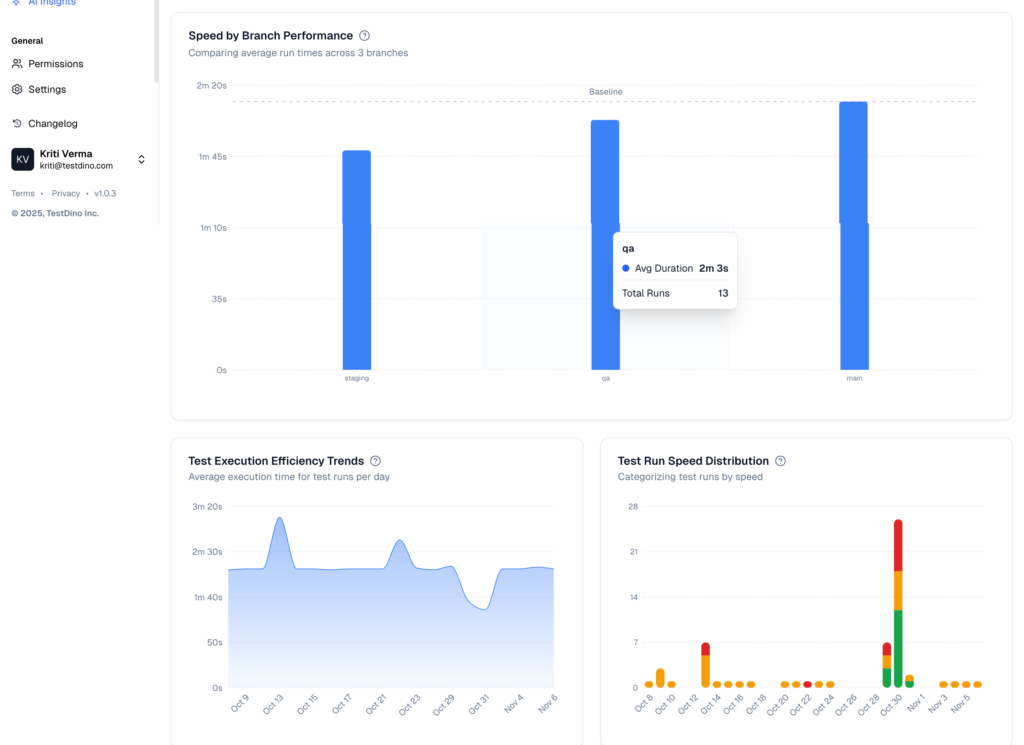 QA leads can instantly see whether flaky test rates spiked on staging or if test speeds dipped last week