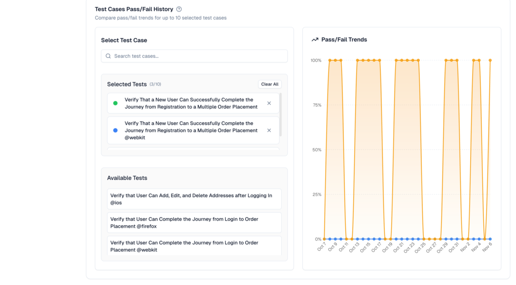 Verifiable history: Review the complete run history to check if retries or fixes stabilized flaky tests; see run-to-run patterns and recurring instability.