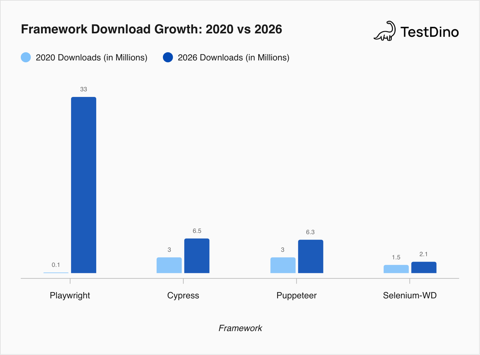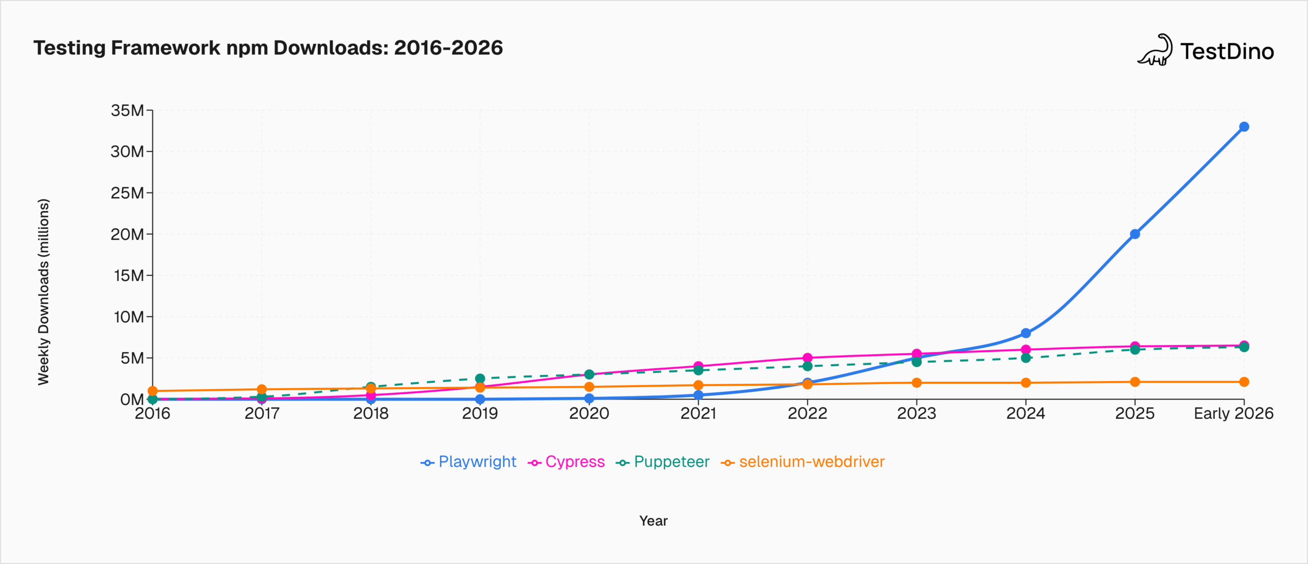 | 2026 | Playwright leads with 34M+ weekly downloads; AI-driven test generation and MCP integration emerge |
