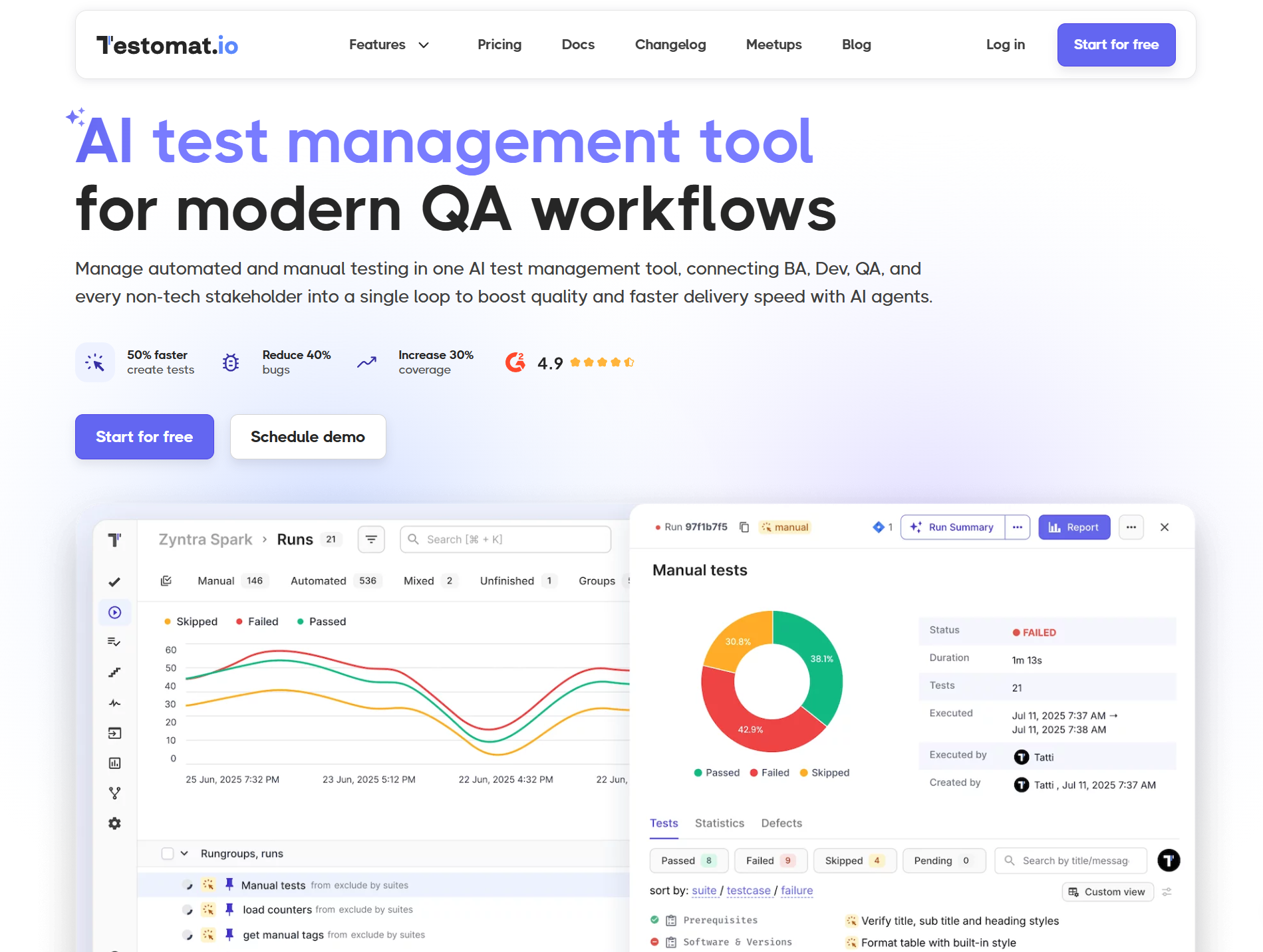 Testomat.io organizes manual and automated tests in a clean workspace with folder structures, tags, and run history. It integrates with Playwright, Cypress, and other frameworks through a CLI reporter. Flaky tests get auto-tagged based on run history. For teams that need structured test case management with basic run reporting, it covers the fundamentals.